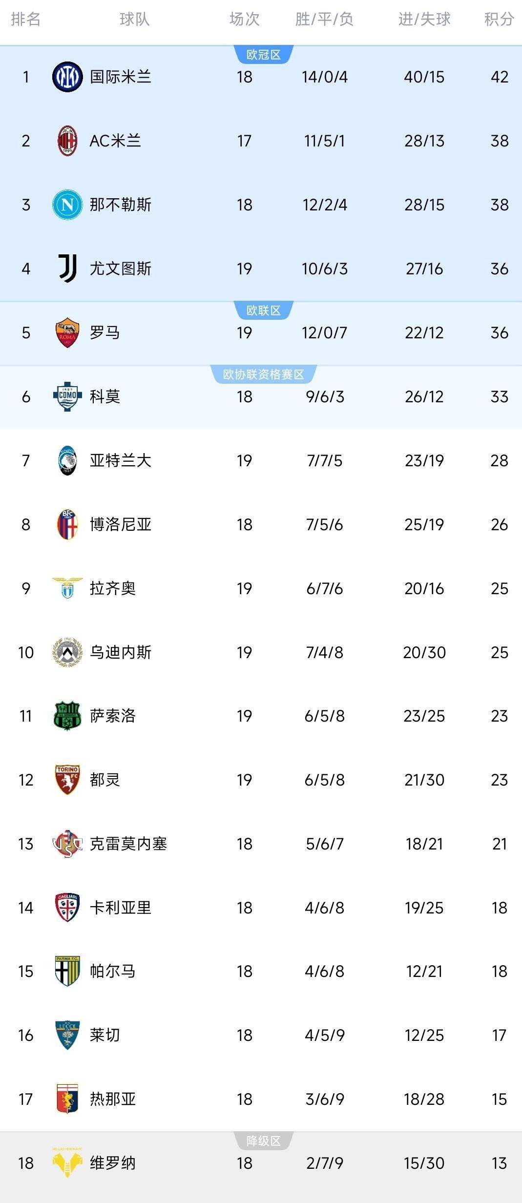 随着这两场比赛结束,意甲积分榜发生了微妙而关键的变化。 根据赛后更新的积分榜,国际米兰在踢完19场比赛后,战绩为14胜0平4负,进40球失15球,积42分,继续稳坐榜首位置。