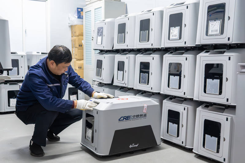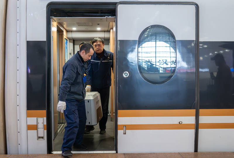 2月3日,在湖北武汉火车站,工作人员将“高铁宠物运输智能箱”搬下列车。 新华社记者 杜子璇 摄