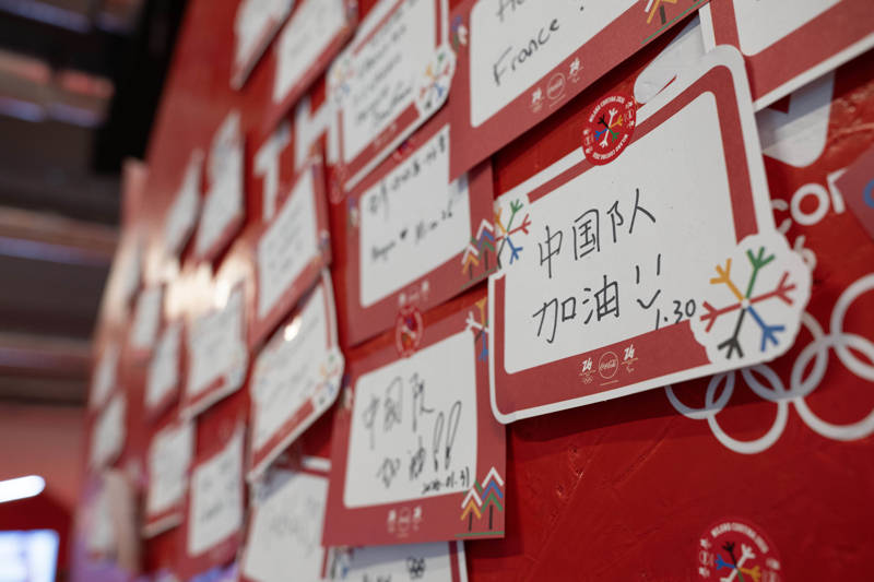 这是2月3日在意大利米兰奥运村拍摄的“中国队加油”祝福贴纸。 新华社记者 张豪夫 摄