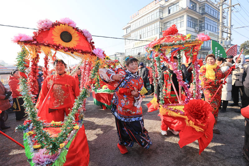 2月2日,在江苏省连云港市赣榆区墩尚镇,人们进行民俗“踩街”表演。 新华社发(司伟摄)