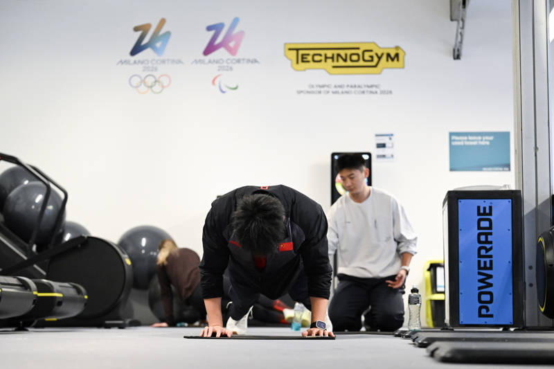 2月3日,在科尔蒂纳丹佩佐奥运村,中国雪车队运动员李纯键(前)在配套健身房内活动。 新华社记者 连漪 摄
