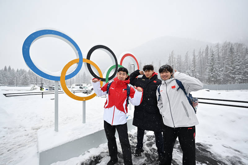 2月3日,在科尔蒂纳丹佩佐奥运村,中国雪车队运动员孙楷智、石曜隆、丁运达(从左至右)与奥运五环合影。 新华社记者 连漪 摄